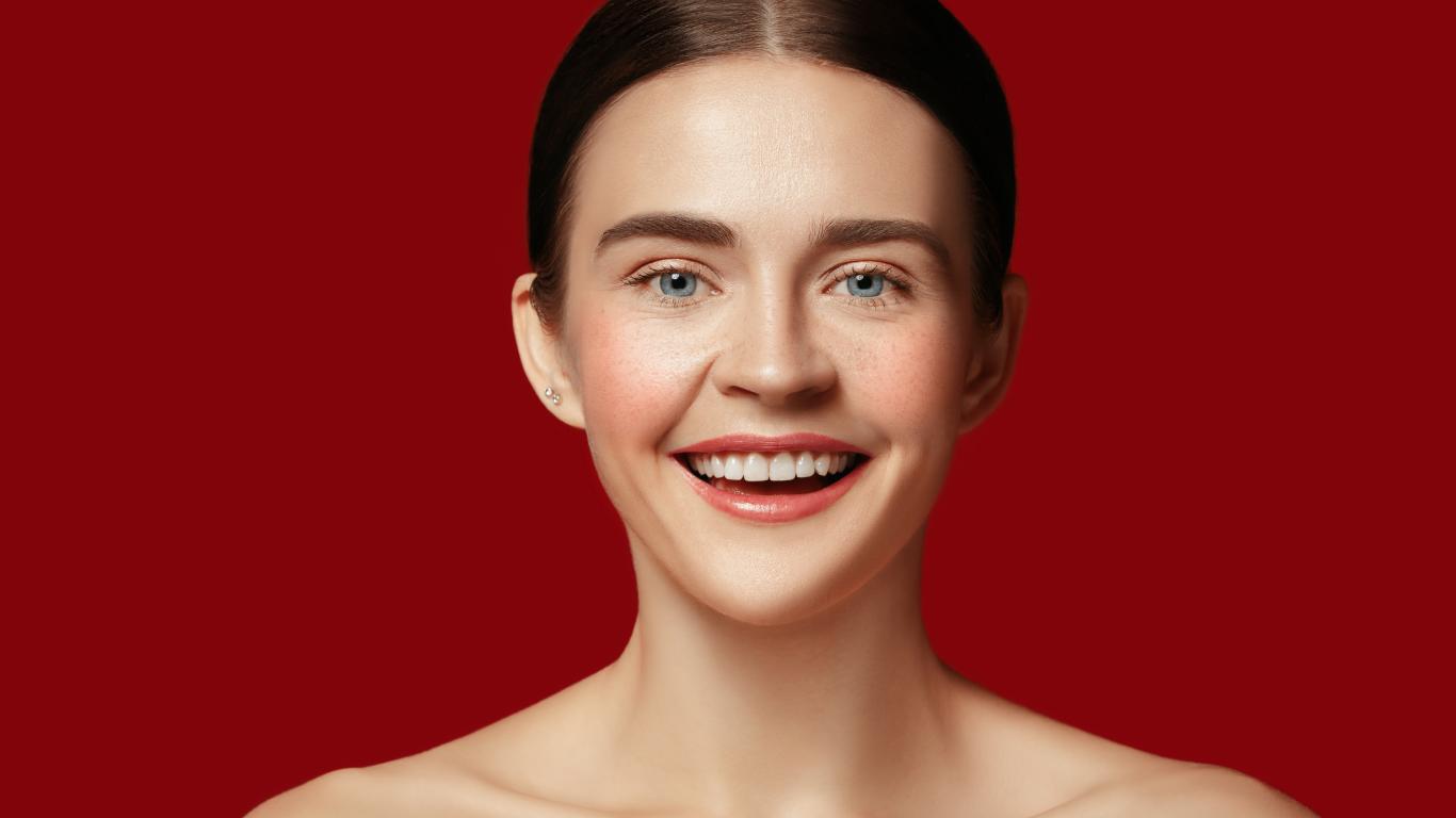 Обои Улыбающаяся молодая девушка на красном фоне