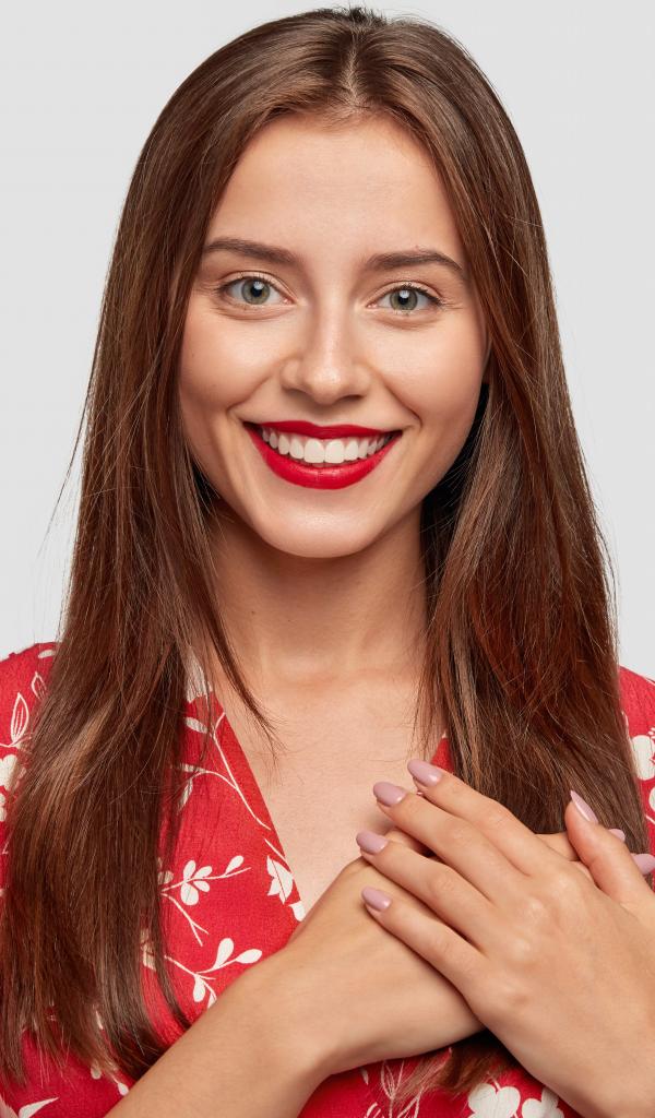 Обои Улыбающаяся девушка с руками на сердце на сером фоне