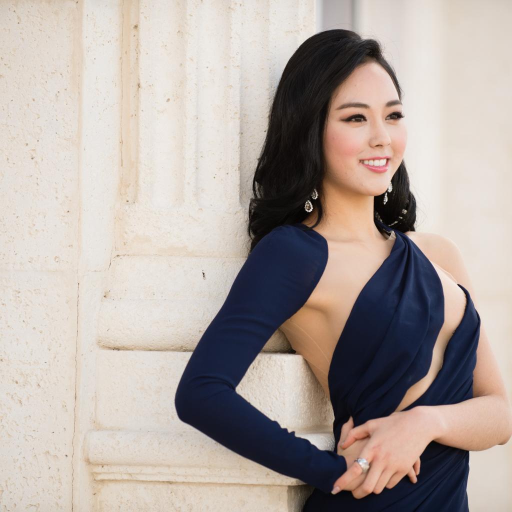 Обои Молодая девушка в платье стоит у стены
