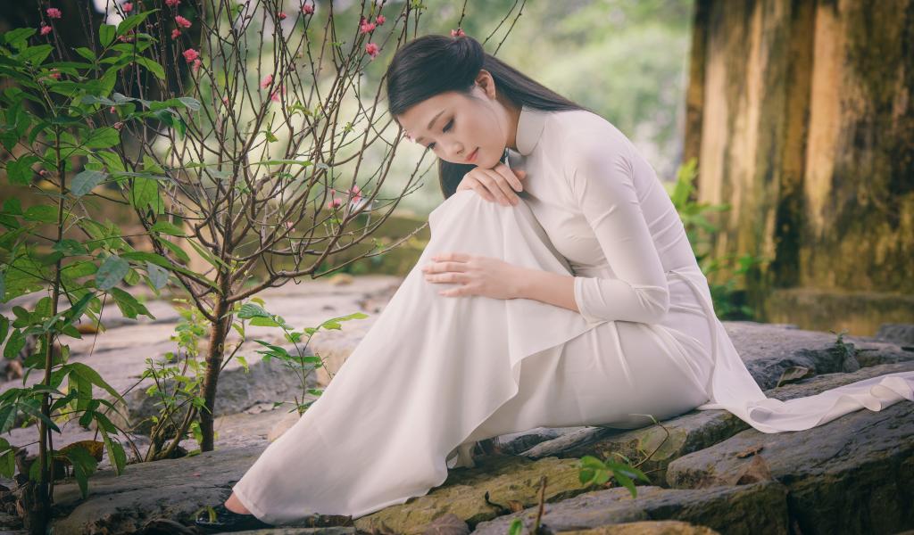 Обои Красивая грустная девушка азиатка в белом платье