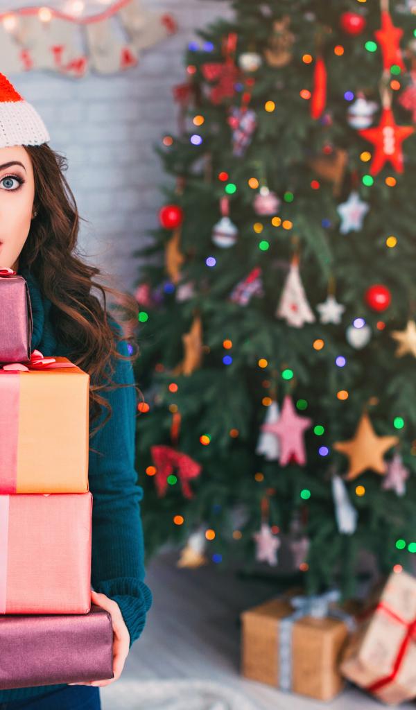 Обои Удивленная девушка с подарками у новогодней елки