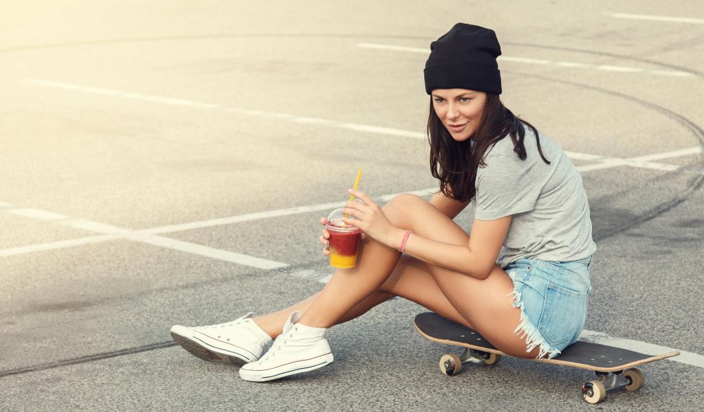 Обои Спортивная девушка сидит на доске для скейтборда