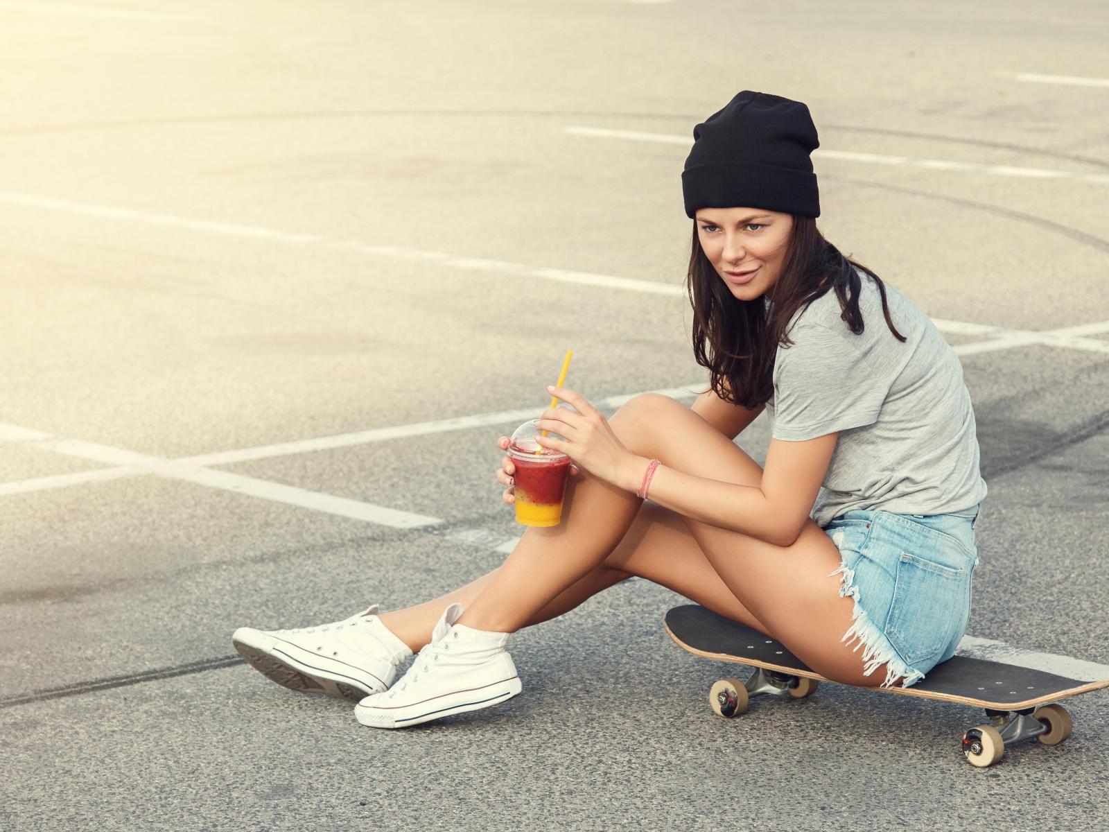 Обои Спортивная девушка сидит на доске для скейтборда