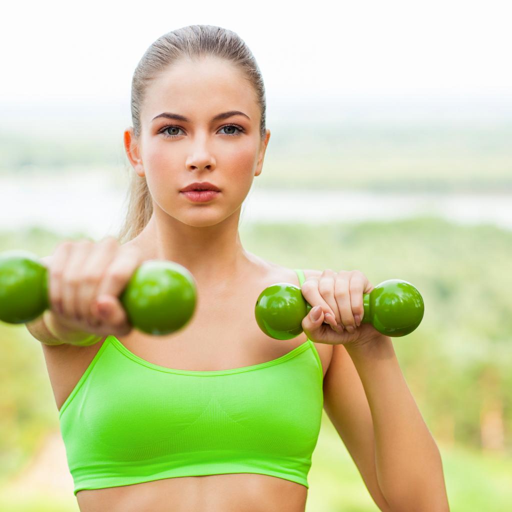 Обои Молодая спортивная блондинка с гантелями в руках