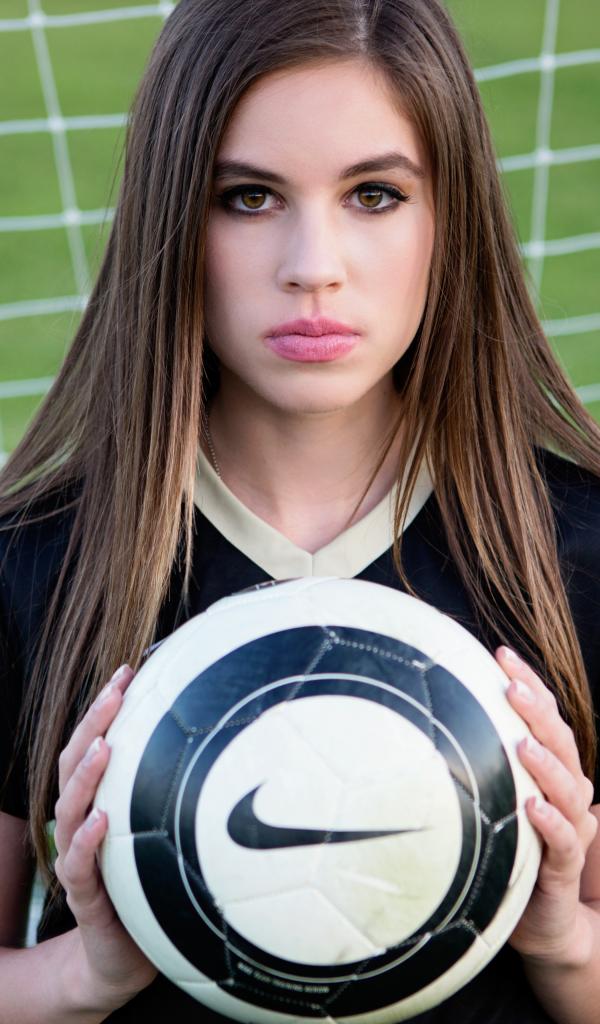 Обои Спортивная девушка вратарь с мячом в воротах