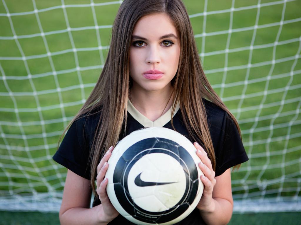 Обои Спортивная девушка вратарь с мячом в воротах