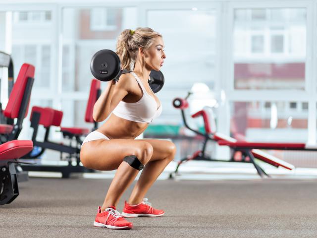 Обои Спортивная девушка поднимает штангу в спортзале