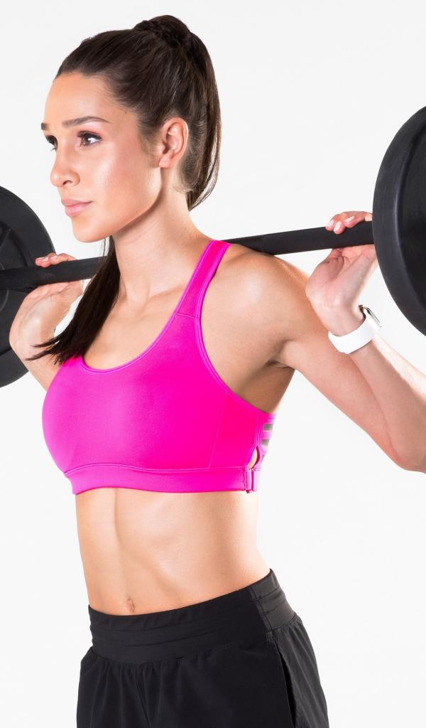 Обои Красивая спортивная девушка со штангой на белом фоне