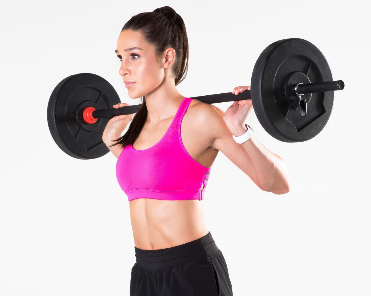 Обои Красивая спортивная девушка со штангой на белом фоне