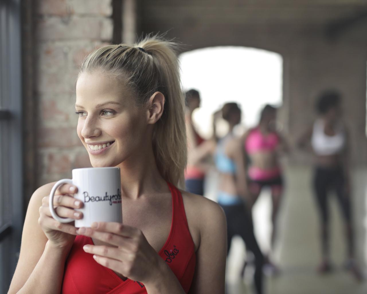 Обои Улыбающаяся спортивная девушка с чашкой кофе у окна