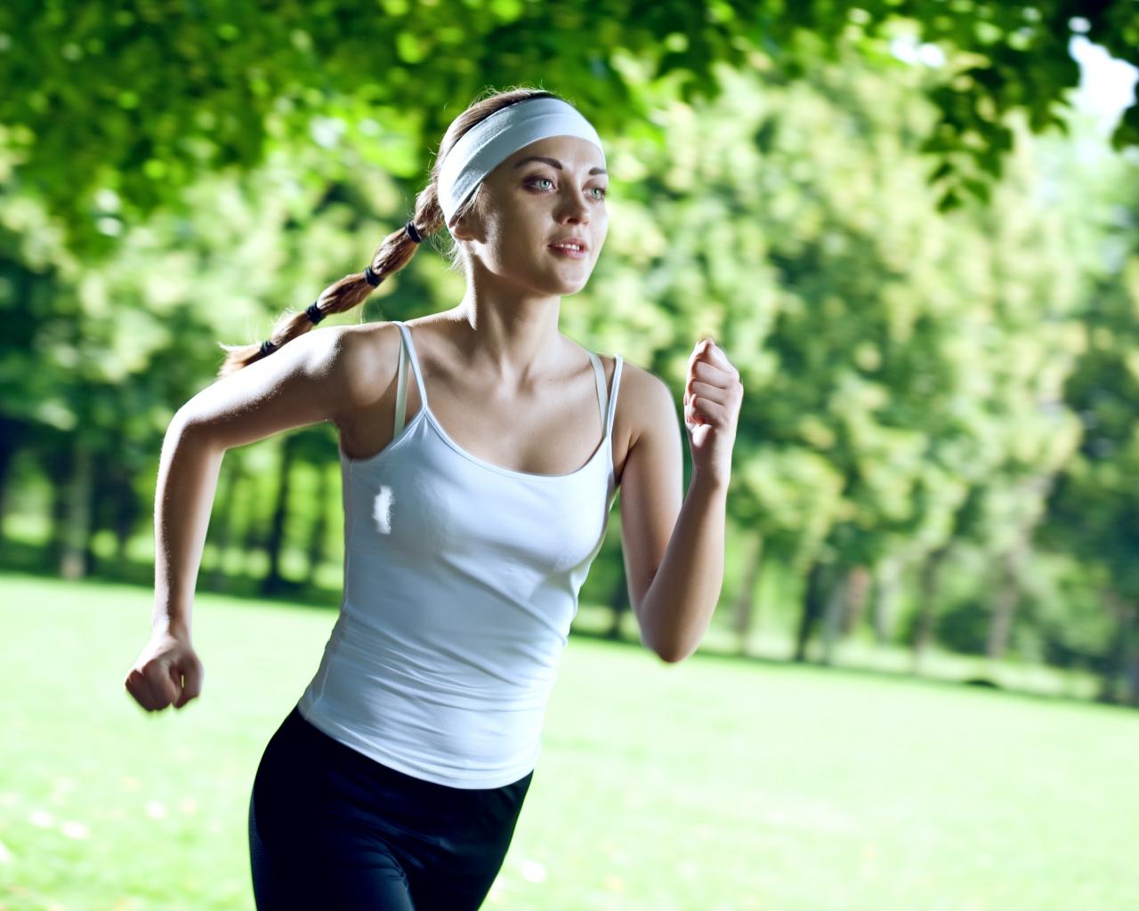 » Обои Девушка спортсменка в белой майке занимается бегом