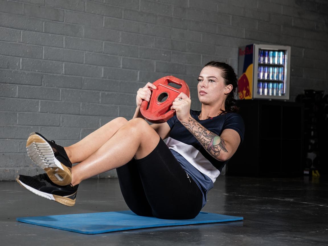Обои Сильная девушка с татуировками на руке качает пресс