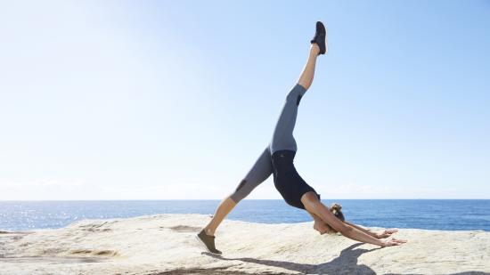 Обои Спортивная девушка делает упражнения на берегу моря