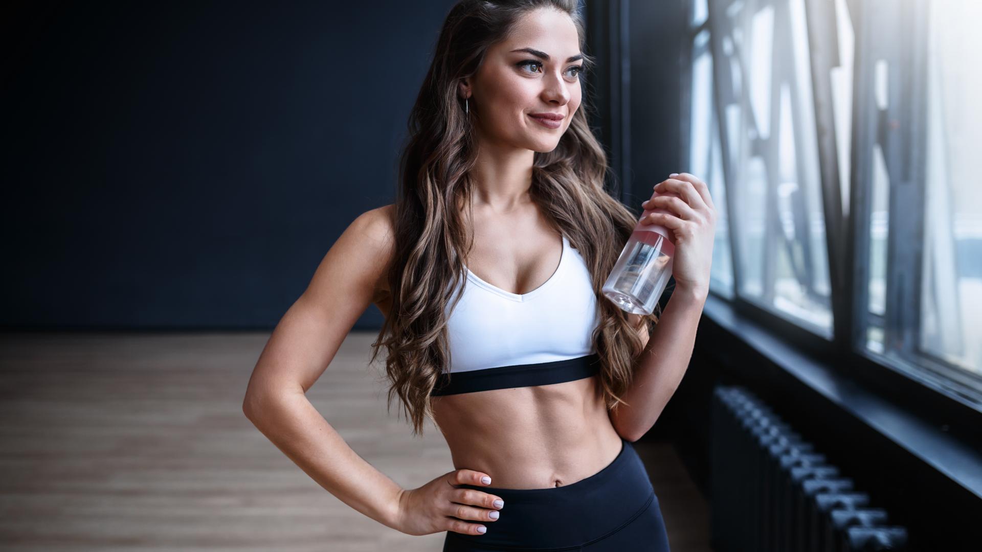 Обои Красивая спортивная девушка с бутылкой воды в руке