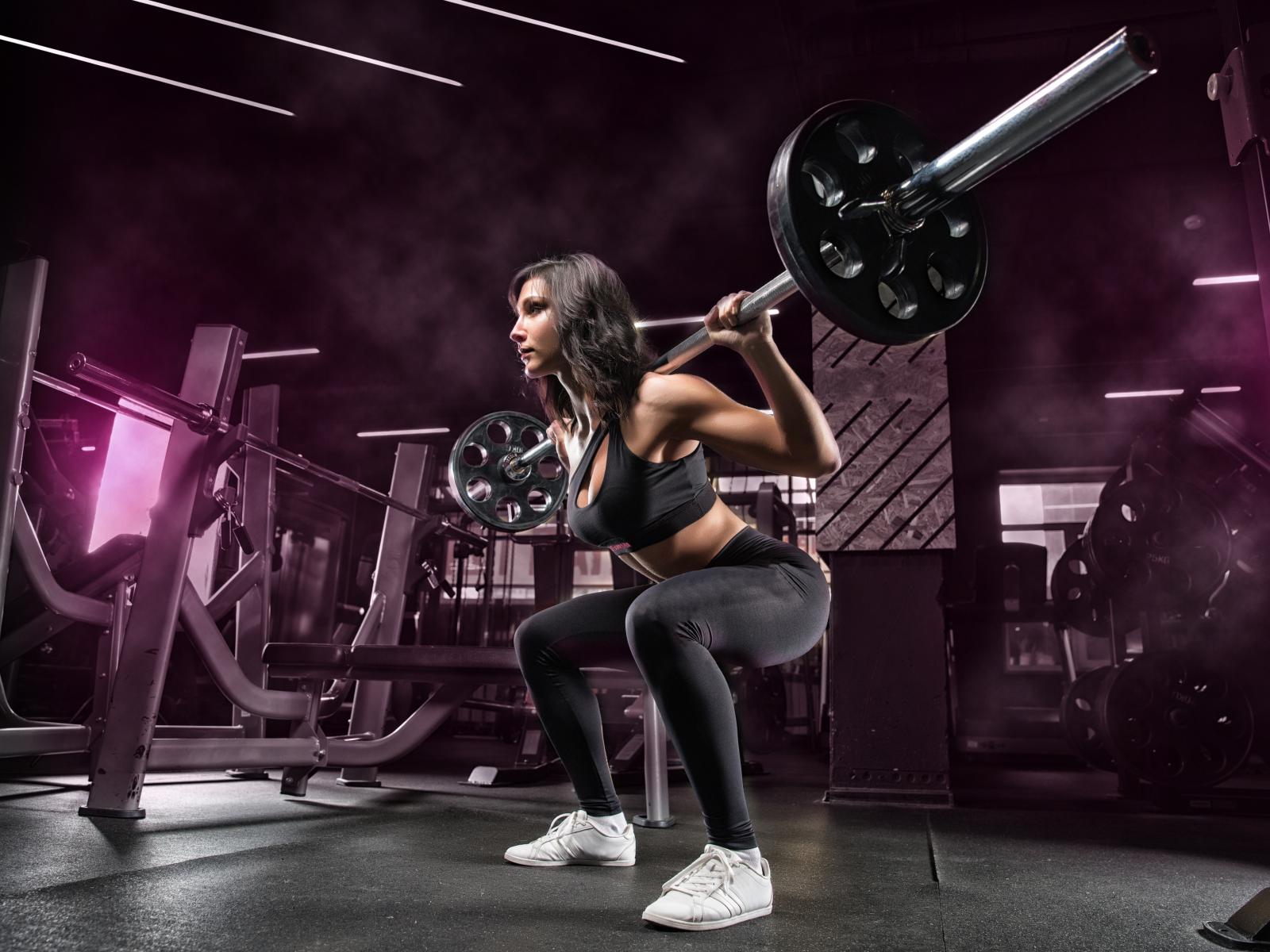 Обои Девушка тяжелоатлет поднимает штангу в спортзале