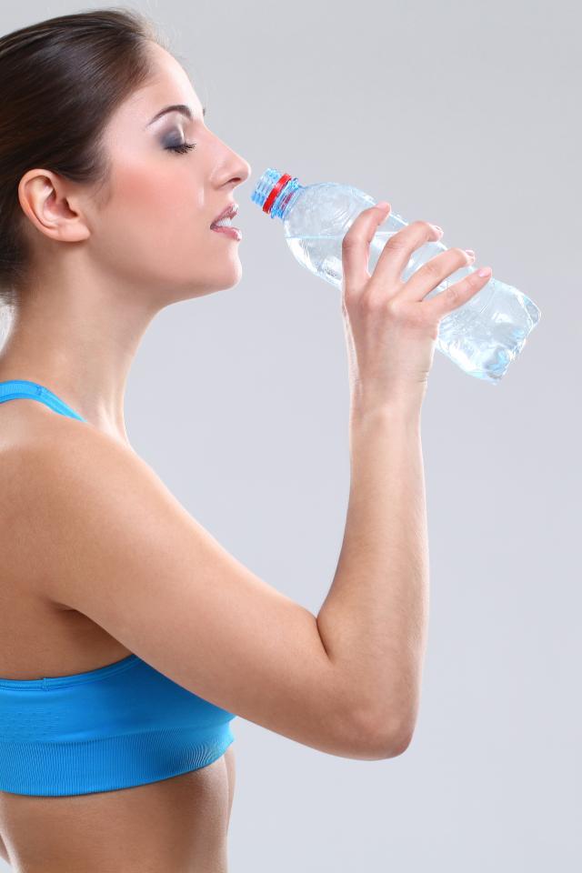 Обои Красивая спортивная девушка пьет воду на сером фоне