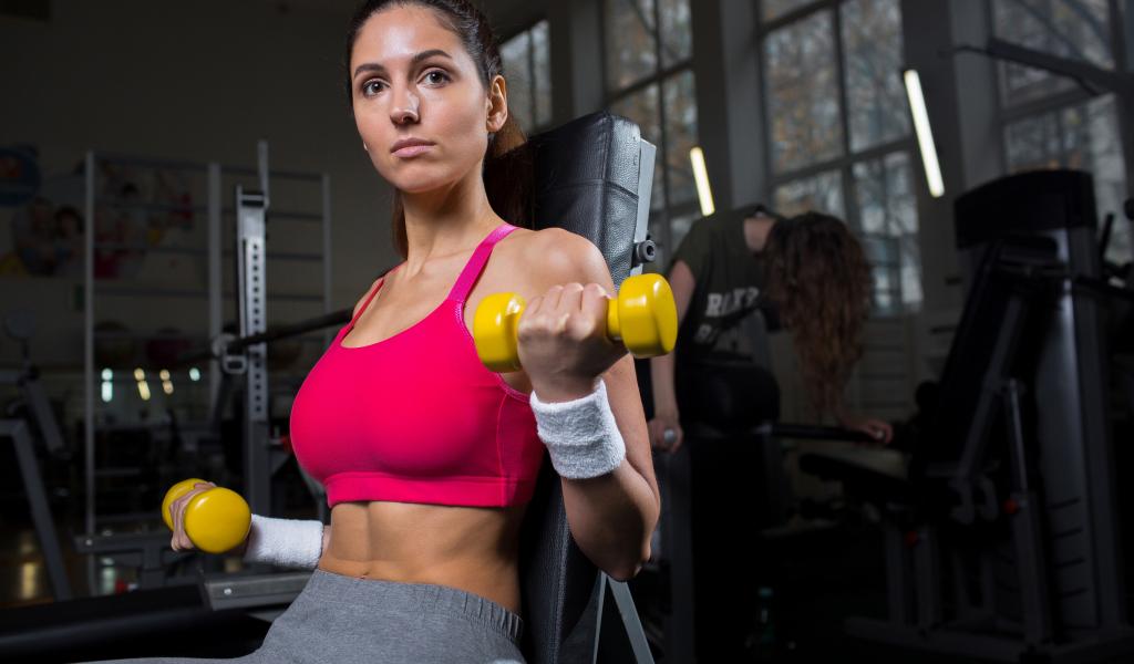 Обои Спортивная девушка качает руки желтыми гантелями в спортзале