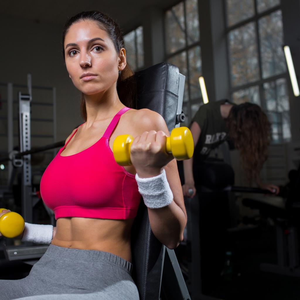 Обои Спортивная девушка качает руки желтыми гантелями в спортзале