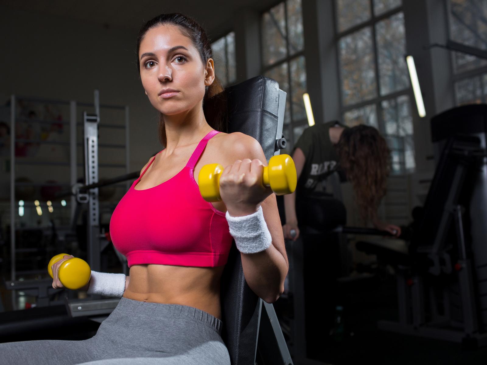 Обои Спортивная девушка качает руки желтыми гантелями в спортзале