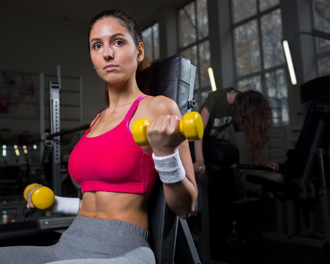 Обои Спортивная девушка качает руки желтыми гантелями в спортзале
