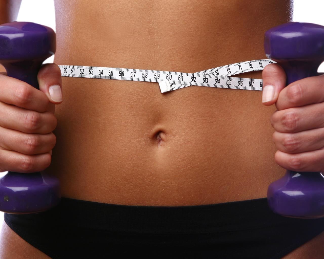 Обои Стройная спортивная девушка с гантелями в руках