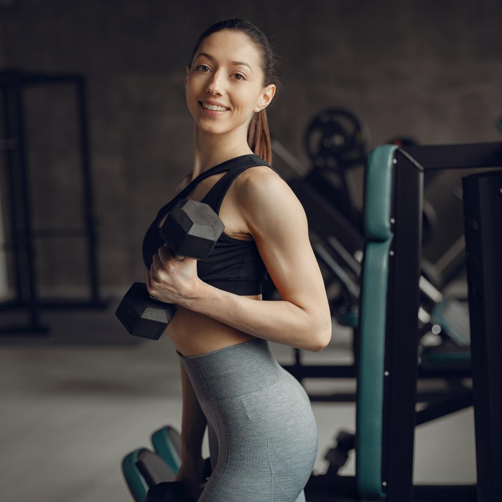 Обои Улыбающаяся спортивная стройная девушка в спортзале с гантелями