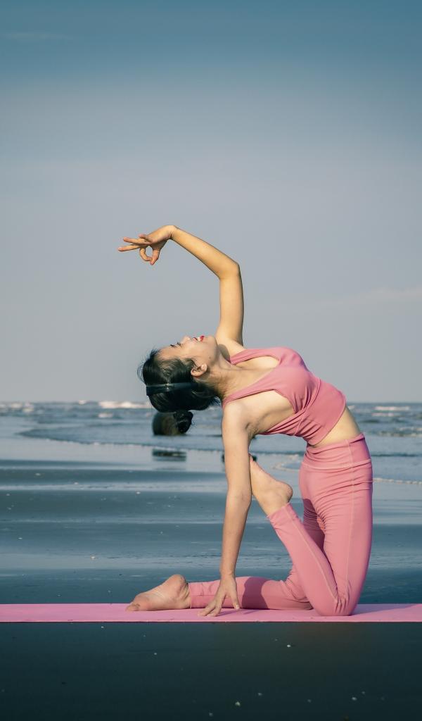 Обои Спортивная девушка занимается йогой на берегу океана