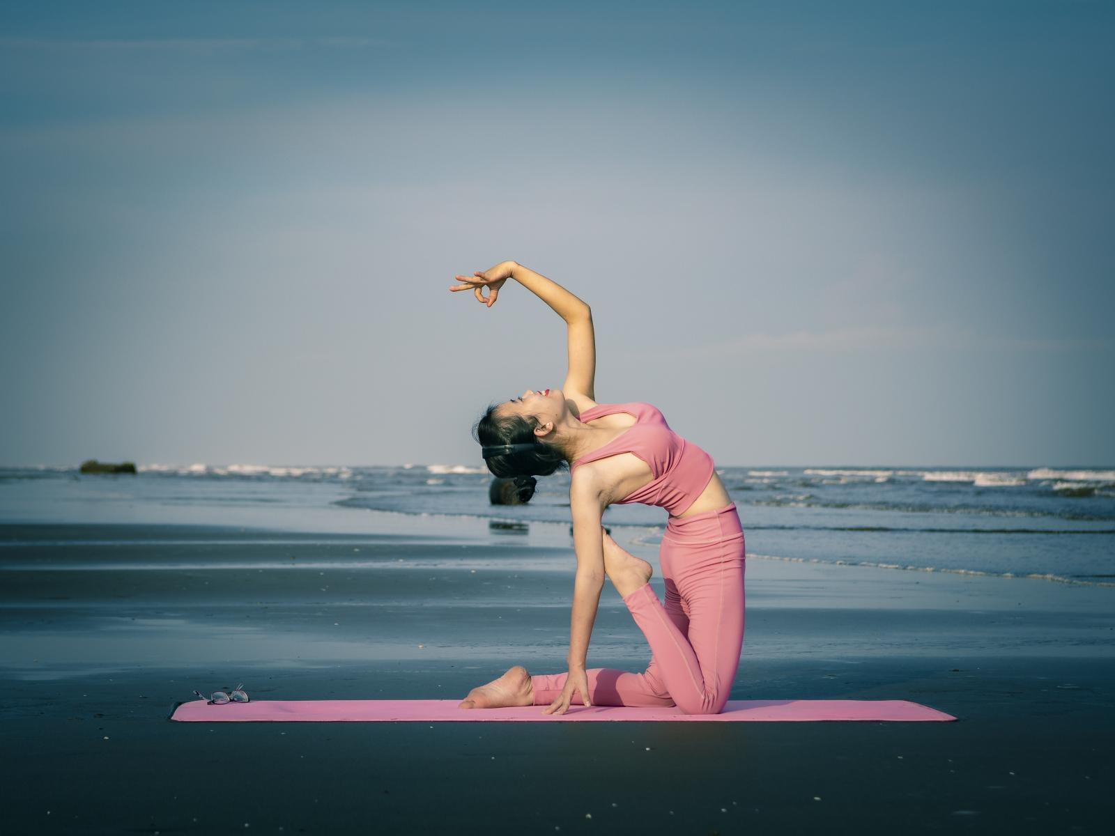 Обои Спортивная девушка занимается йогой на берегу океана