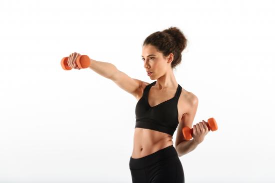 Обои Девушка качает руки гантелями на белом фоне