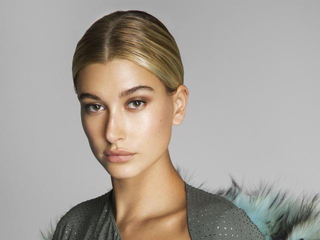 Обои Серьезная блондинка, модель Хейли Болдуин на сером фоне