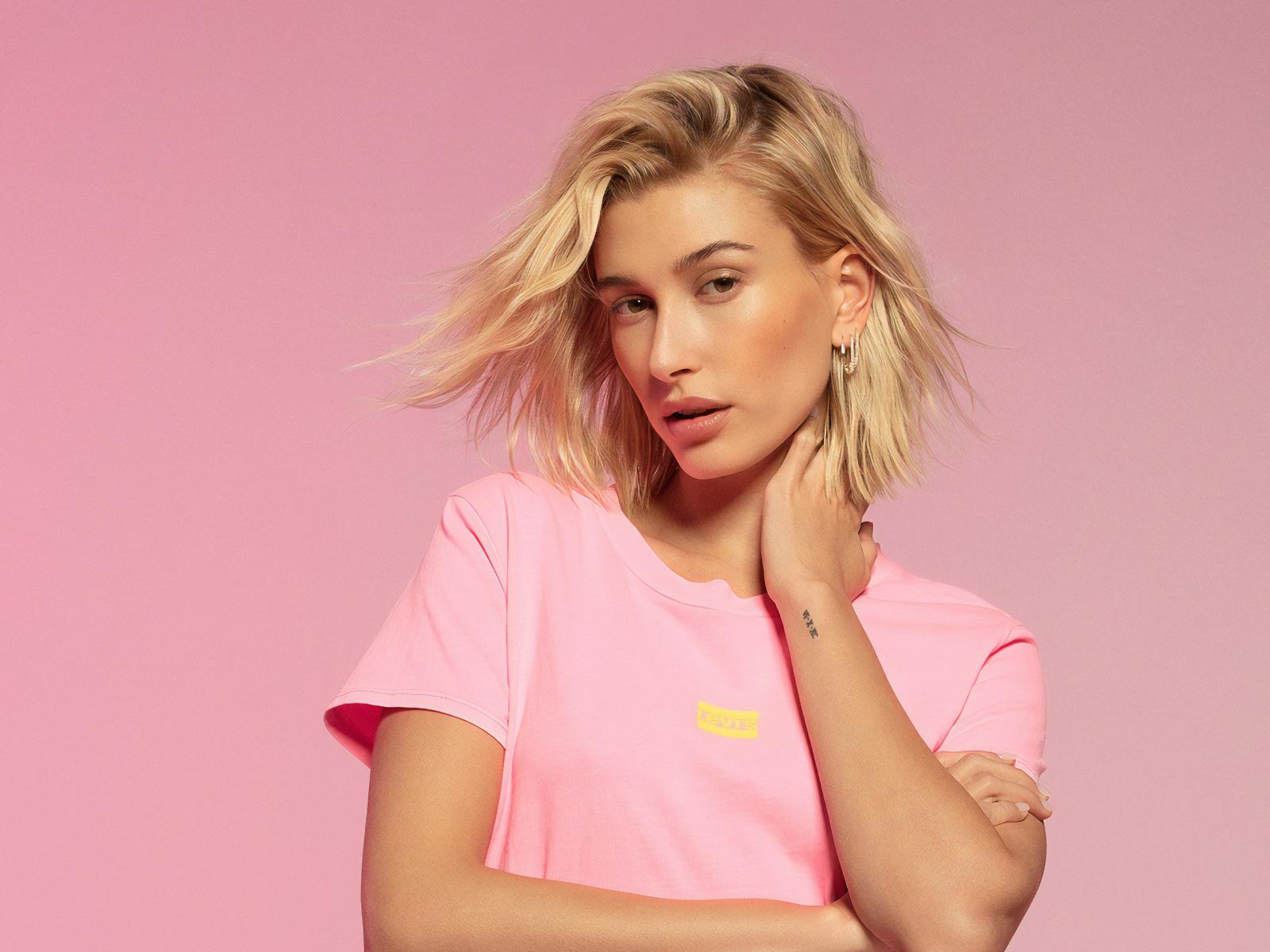 Обои Красивая блондинка, модель Хейли Болдуин на розовом фоне