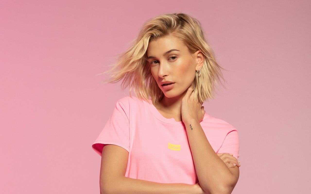 Обои Красивая блондинка, модель Хейли Болдуин на розовом фоне