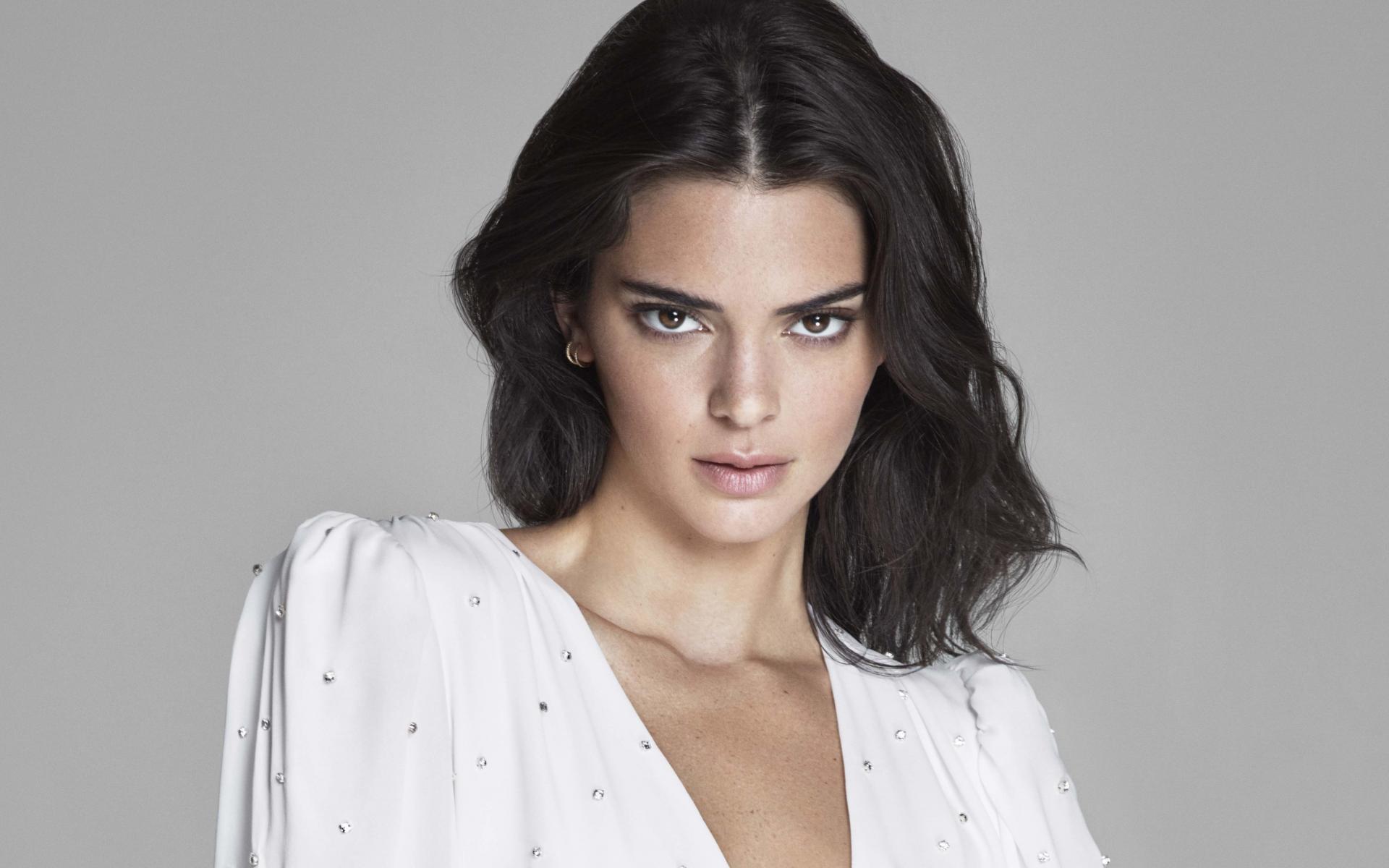 Обои Взгляд брюнетки Кендалл Дженнер на сером фоне