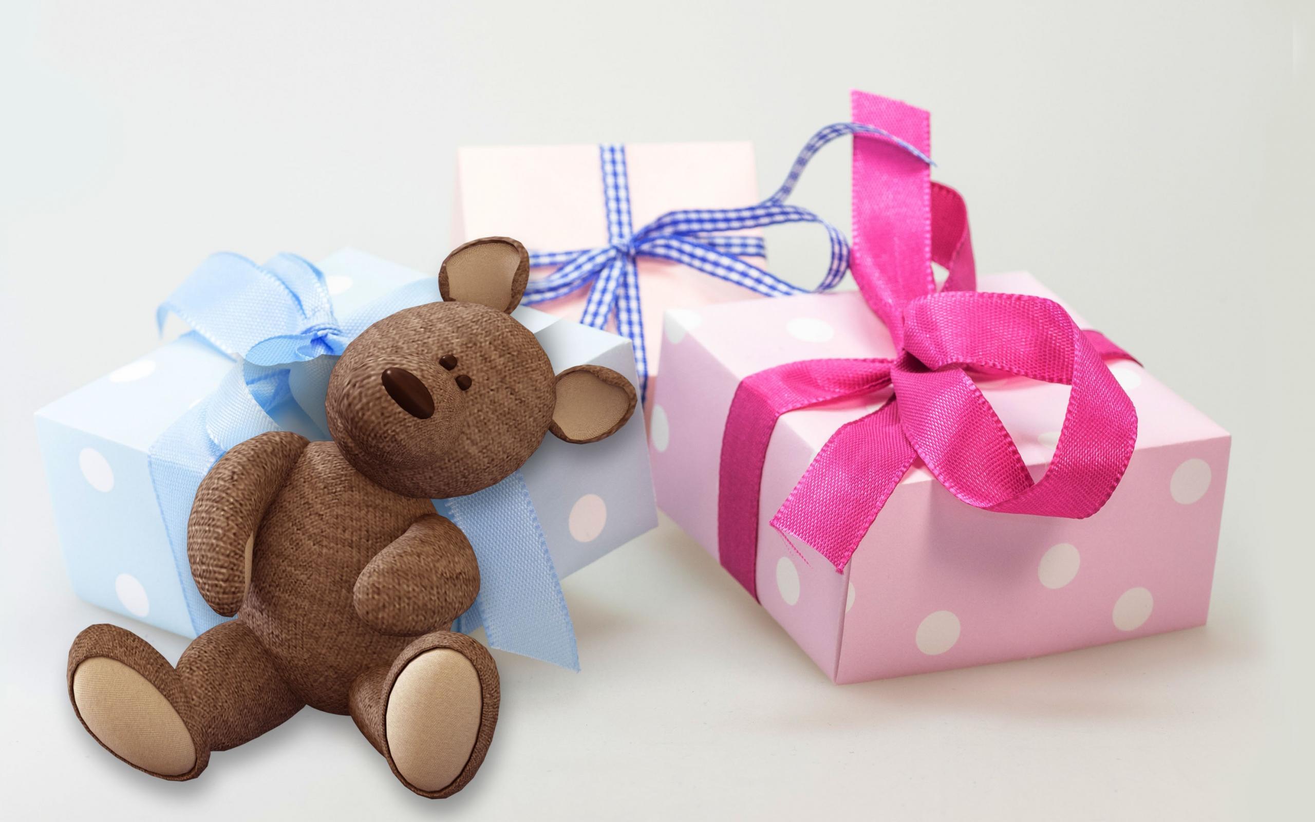 Обои Подарки и медвежонок на белом фоне