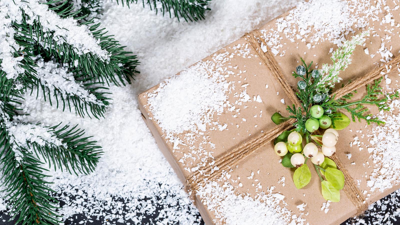 Обои Подарок с заснеженной веткой ели на столе