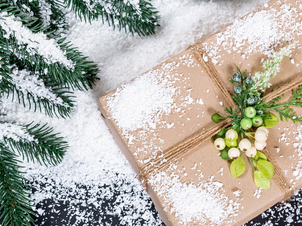 Обои Подарок с заснеженной веткой ели на столе