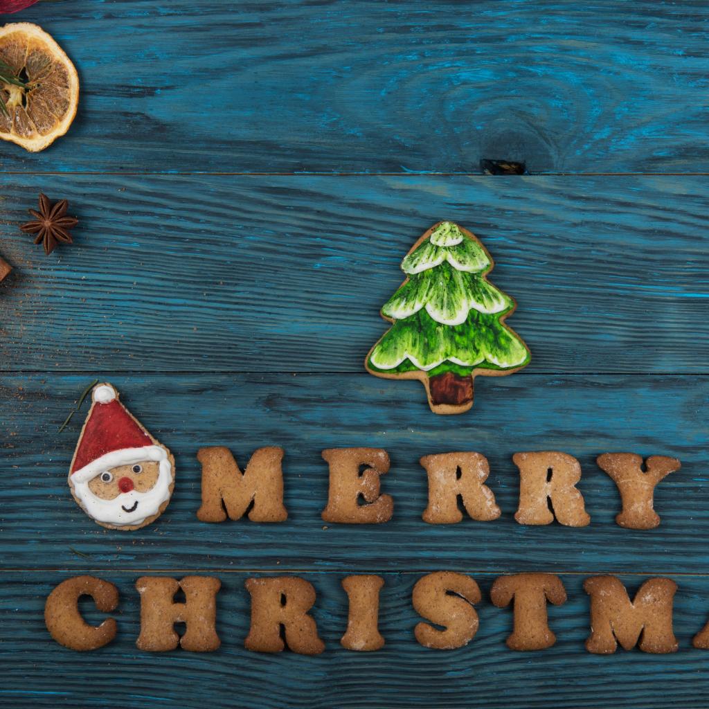 Обои Печенье с надписью Merry Christmas на голубом столе