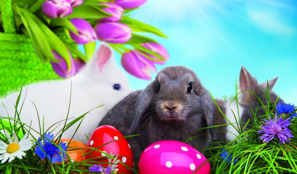 Обои Разноцветные яйца и пасхальные кролики