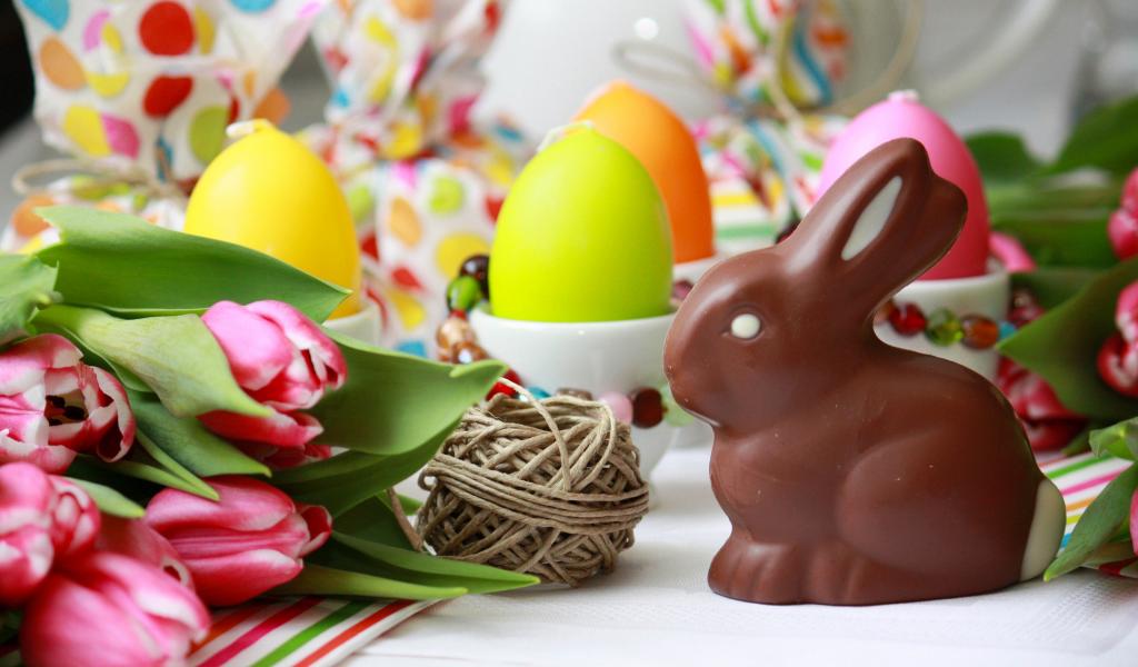 Обои Шоколадный пасхальный кролик и тюльпаны