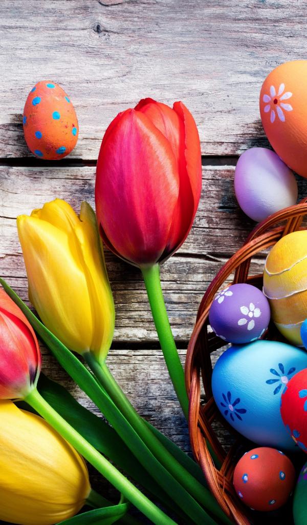 Обои Крашеные яйца на столе с тюльпанами на Пасху