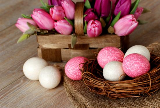 Обои Крашеные яйца с корзиной розовых тюльпанов на Пасху
