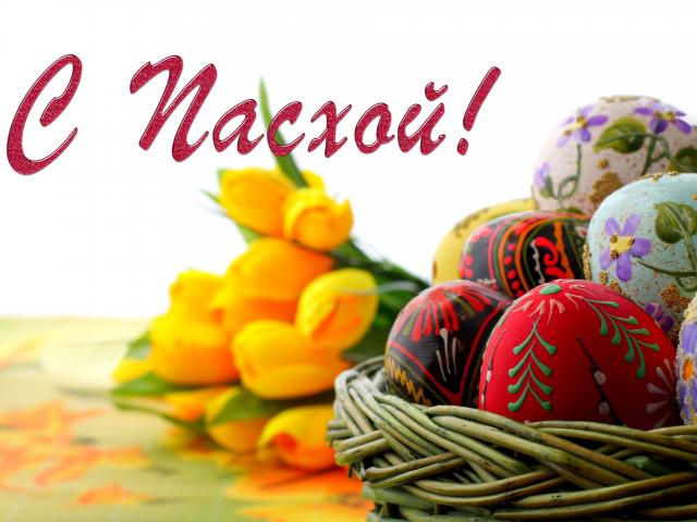 Обои Разукрашенные яйца с букетом желтых тюльпанов на Пасху