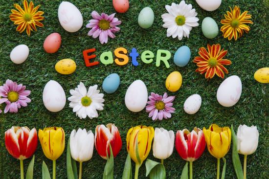 Обои Надпись Easter на зеленой траве с крашеными яйцами и цветами