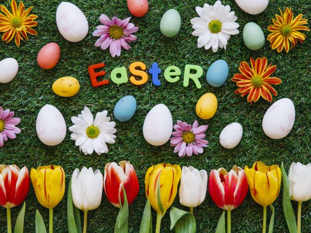 Обои Надпись Easter на зеленой траве с крашеными яйцами и цветами
