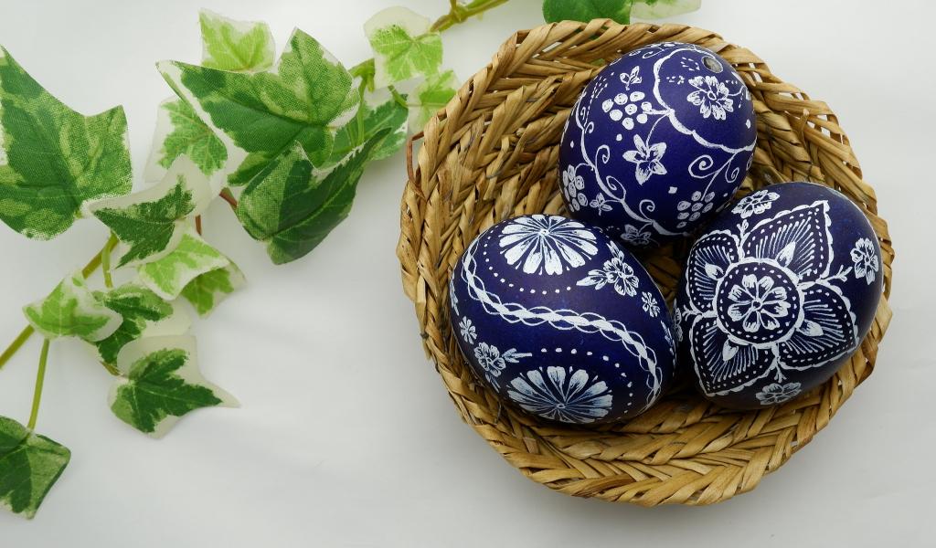 Обои Три раскрашенных яйца в корзинке на столе с веткой