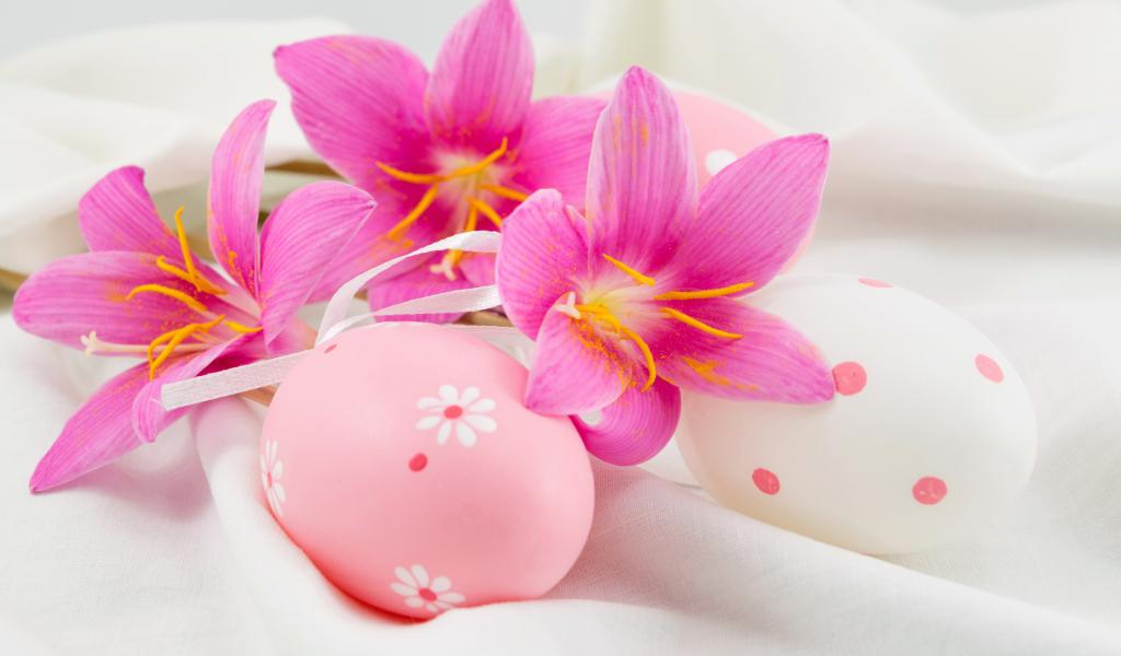Обои Розовые яйца с цветами на белой ткани на Пасху