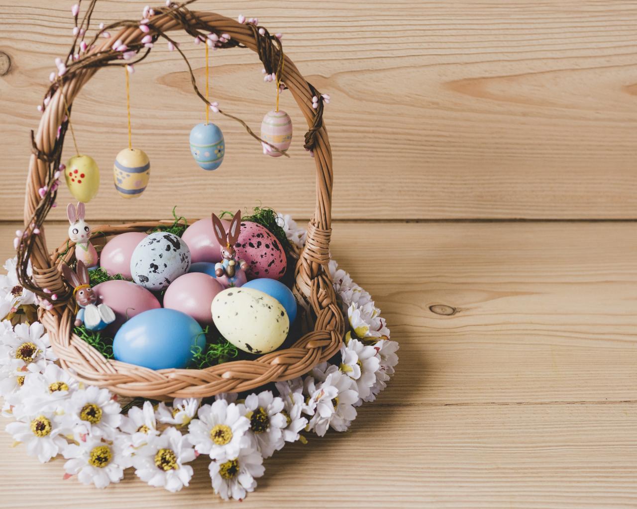 Обои Корзинка с пасхальными яйцами украшена цветами