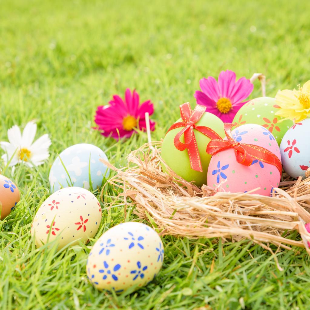 Обои Разноцветные яйца в гнезде на зеленой траве на Пасху