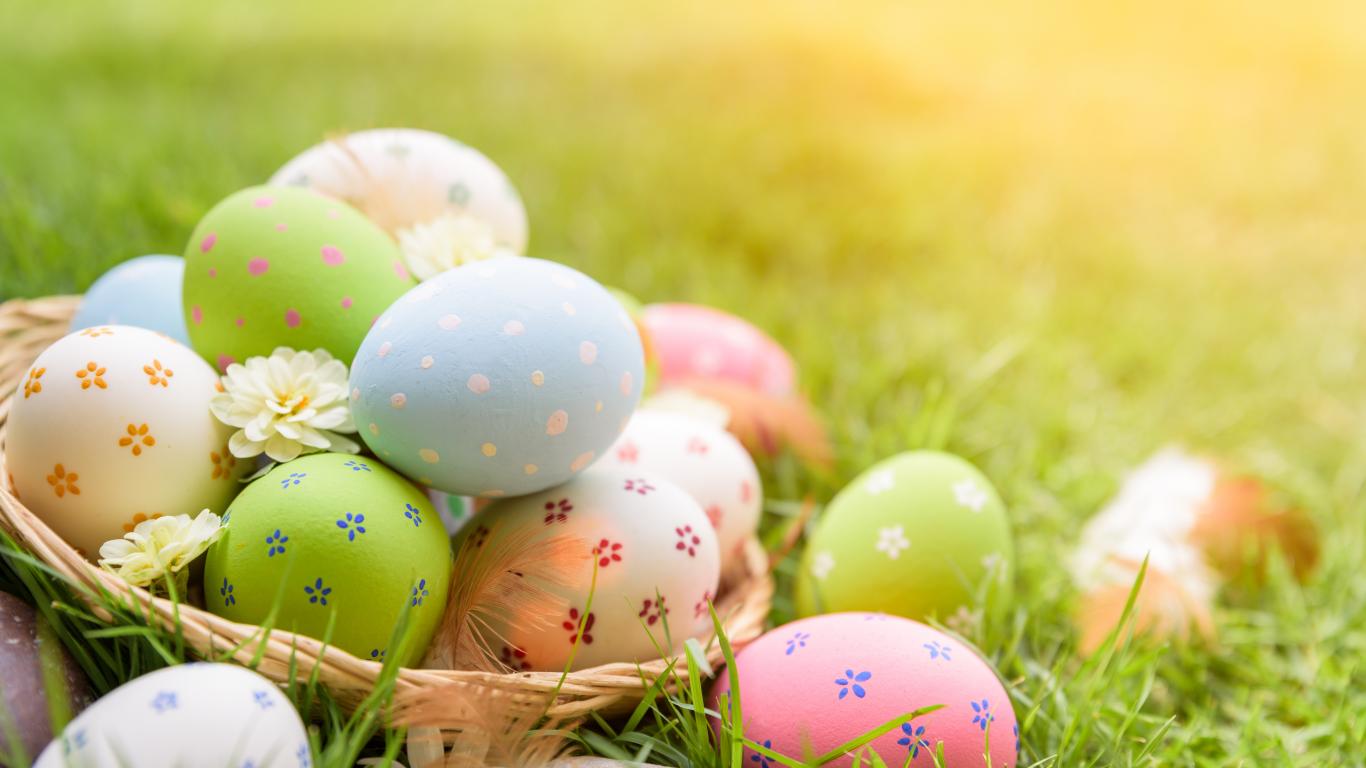 Обои Разноцветные пасхальные яйца в корзинке на зеленой траве