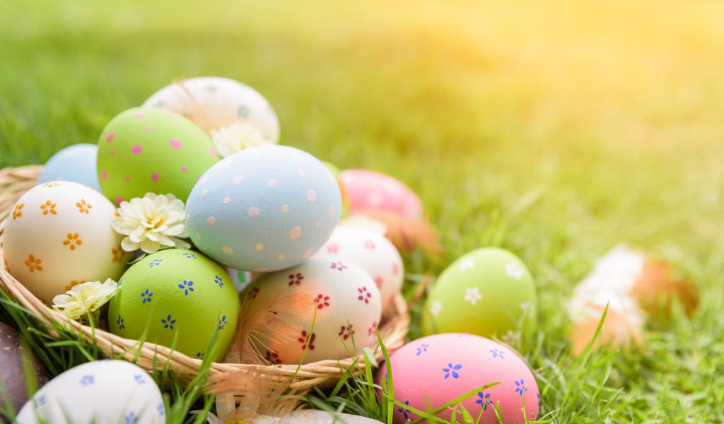 Обои Разноцветные пасхальные яйца в корзинке на зеленой траве
